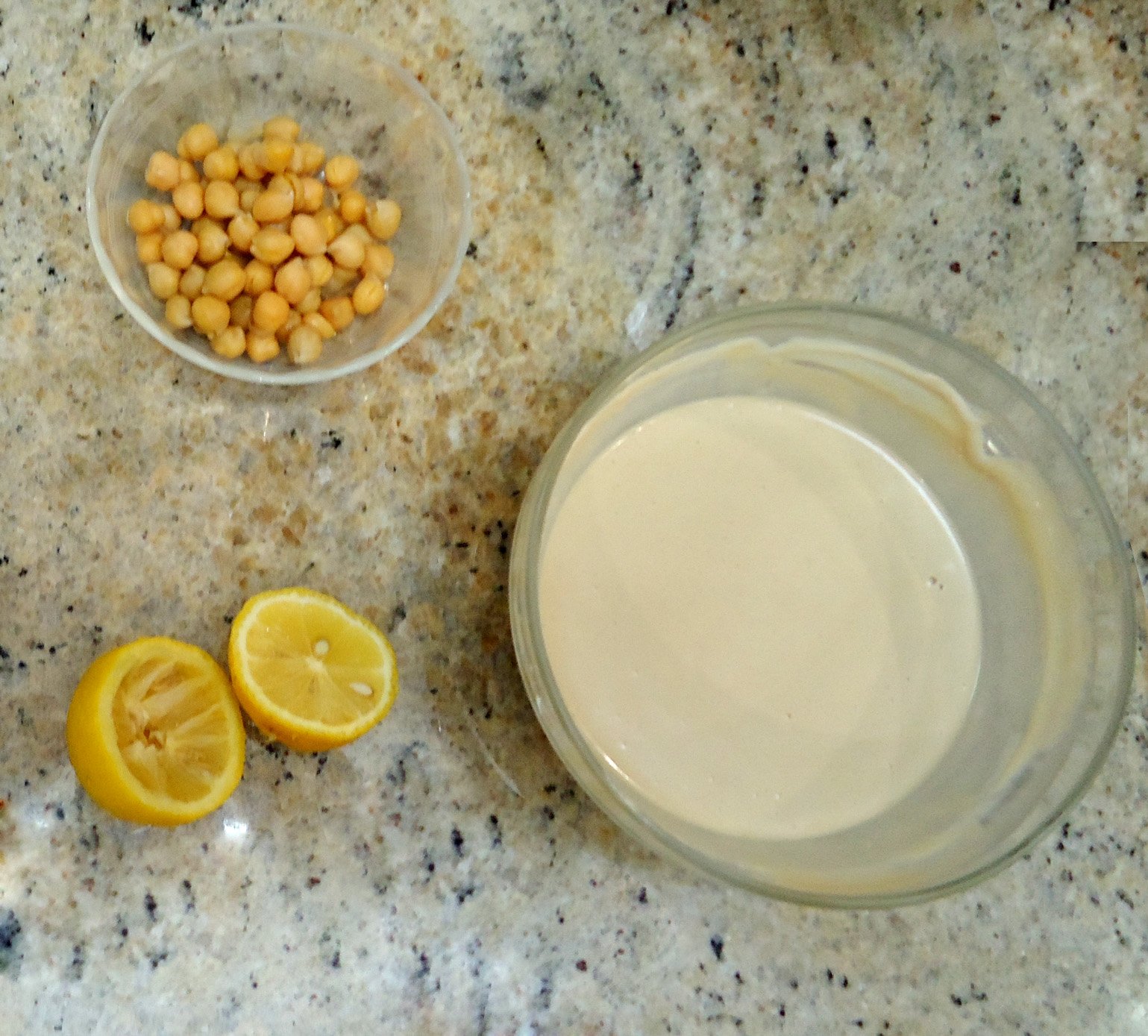 Blend chickpeas with some tahini paste, water to loosen, salt and pepper to taste and garlic to your heart’s desire.