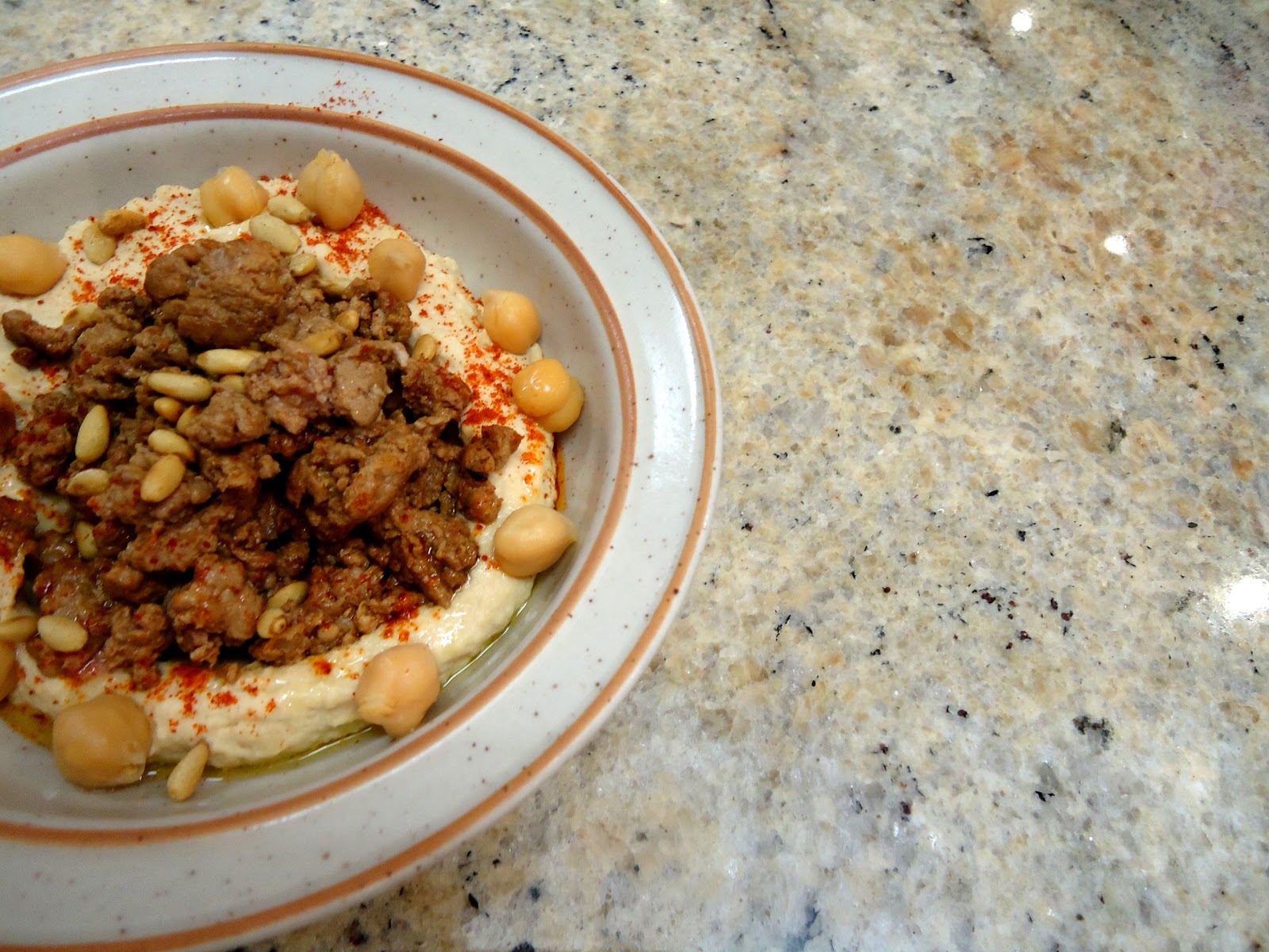 By now you are probably dying to know what that means (or not, but I will tell you anyway), it translates to “Hummus with Meat” but what it means when you order it at a restaurant in Israel is A plate full of hummus, topped with fragrant minced, or finely chopped, lamb garnished with paprika, olive oil, whole chickpeas and roasted pine nuts. Add to that some warm pita breads, pickles and salad and you have a hearty, healthy and very very filling meal.